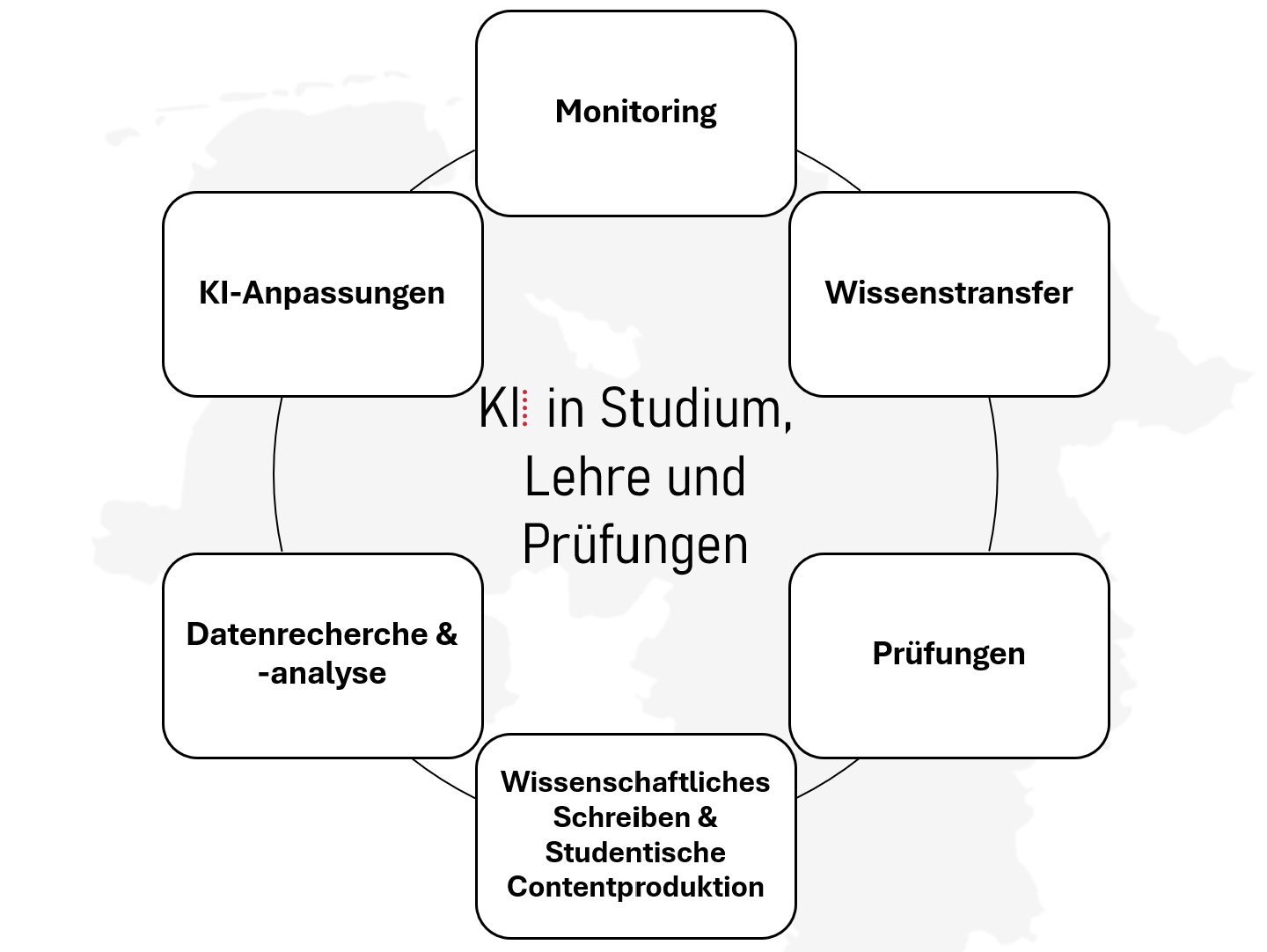 Themen: KI; KI-Technologien; Hochschuldidaktik; Studium; Lehre; Prüfung; Rechtliches; Datenschutz; Chatbots; Personalisierung; Qualitätsentwicklung; Kompetenzentwicklung; Weiterbildung; Ethik